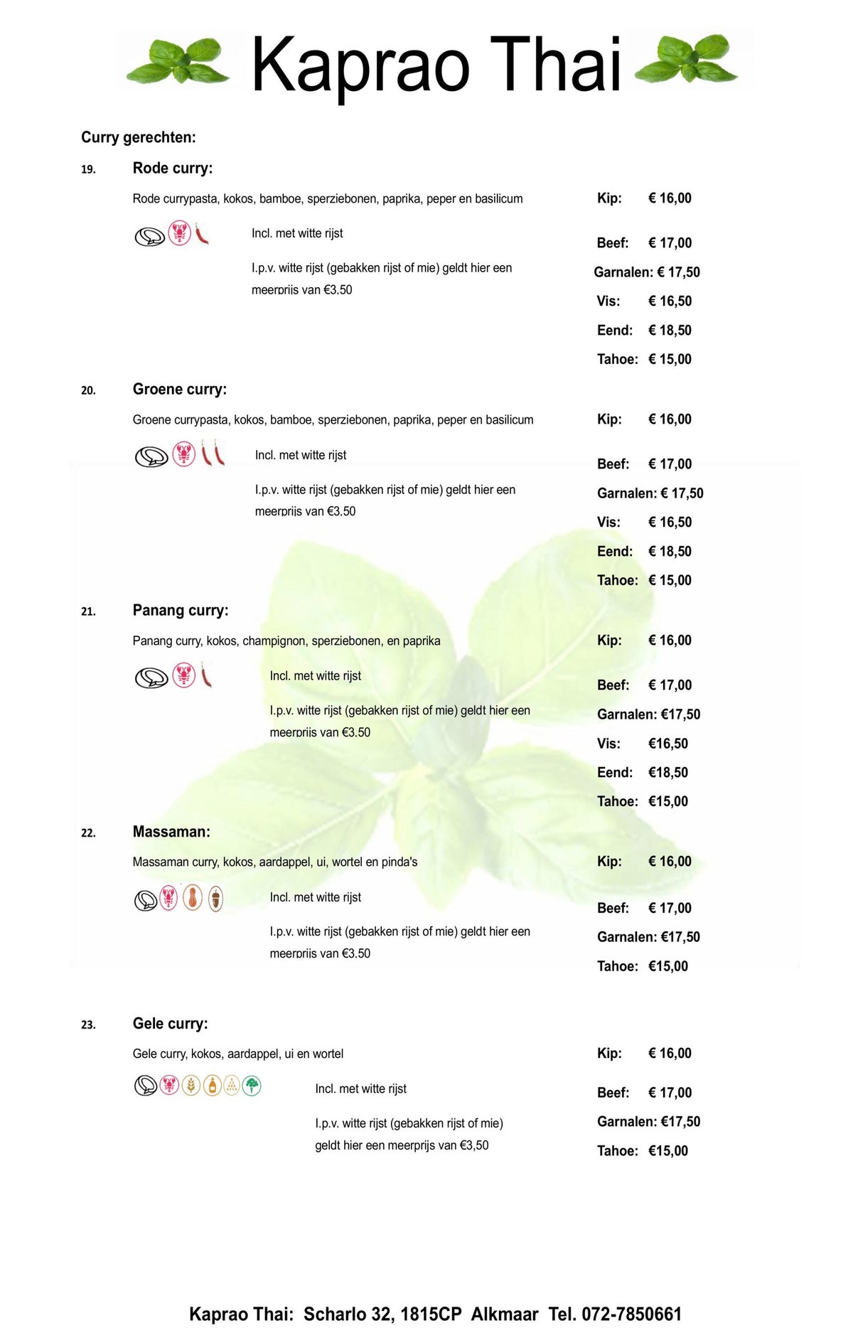 Op de menukaart van Kaprao Thai vind je een uitgebreide selectie van heerlijke Thaise gerechten. Van pittige curry's tot verfrissende salades en smaakvolle noedels, er is voor ieder wat wils. Laat je verrassen door de authentieke smaken en geuren van de Thaise keuken bij Kaprao Thai.
